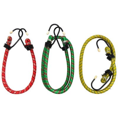 These bungee cords are color coded for length (red - 12 inches; yellow - 18 inches; and green - 24 inches.) package includes 1 of each color. These bungee cords are useful for many things. They come in handy in the garage, on a camping trip, or just travel on your bicycle.* Red is 12 inches long, yellow is 18 inches long, and green is 24 inches long * Rubberized tips prevent scratching or damage to valuable items * Bungee is secured to a hook for easy attachment to many items * Stretches to fit and then stretches back to original size with ease * Great for furniture, bike moving, dollies, and more!