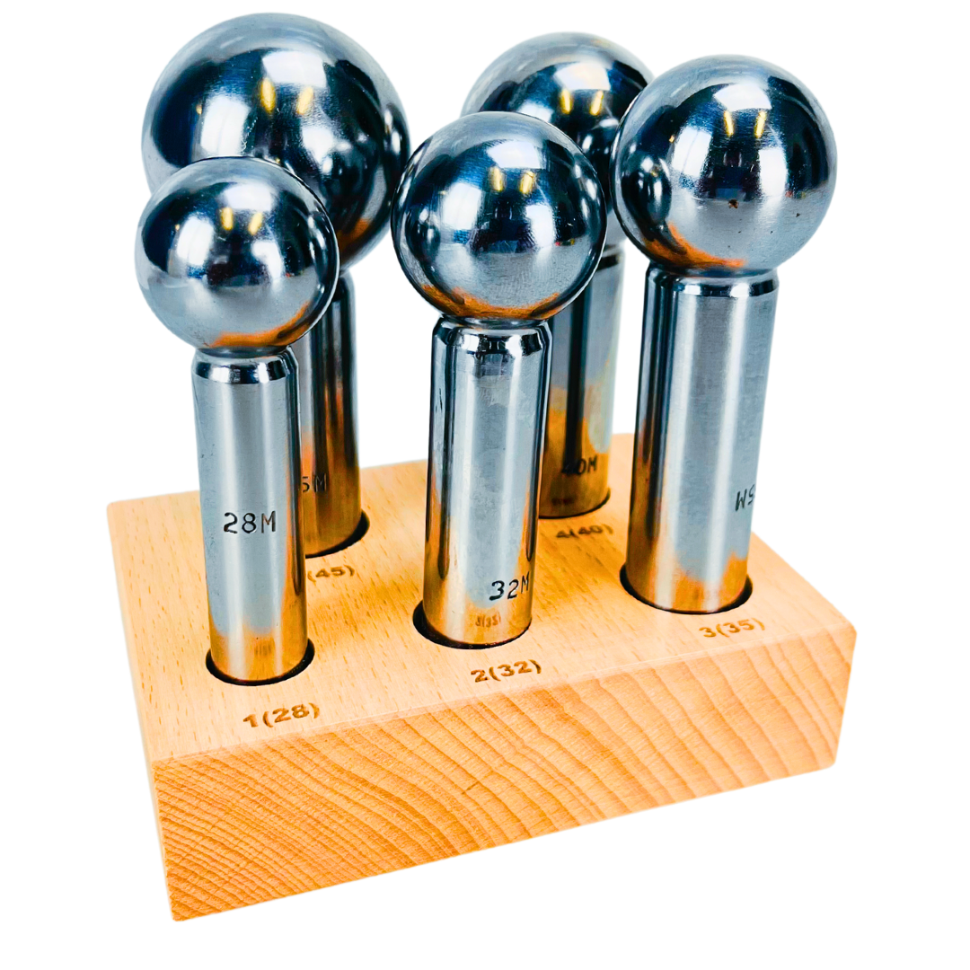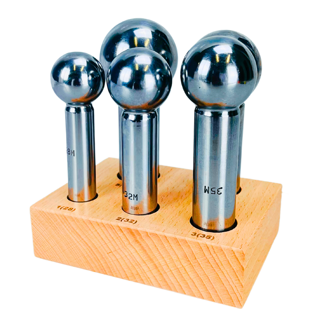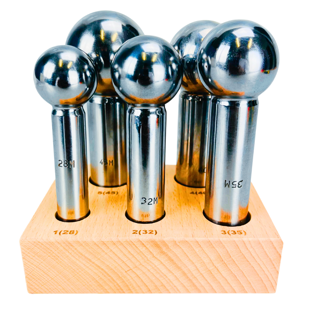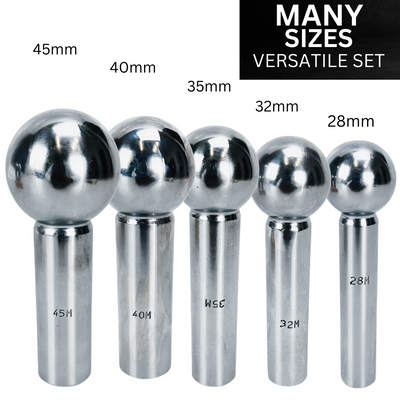 This 5 piece dapping punch set has the larger sizes you have been looking for. These punches are used to bend sheet metal, and are durable and heavy duty. They are excellent quality punches, with the sizes clearly marked on the stand.