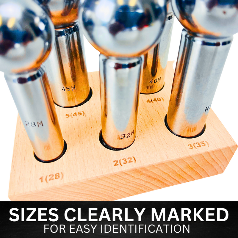Sizes: 28, 32, 35, 40, 45mm (marked on wooden stand for ease)