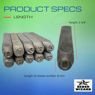 This set of number punches is a little different from the ordinary block style. In this set the 6 and the 9 are not interchangeable. They are quite different from one another. This syle of numbers will lend a little extra flair to your project.* 10 Pieces In The Set * 0-9 Included In Merc Style * 1/4" Print Size * Punches Are 2.75" Long * Hardened Steel