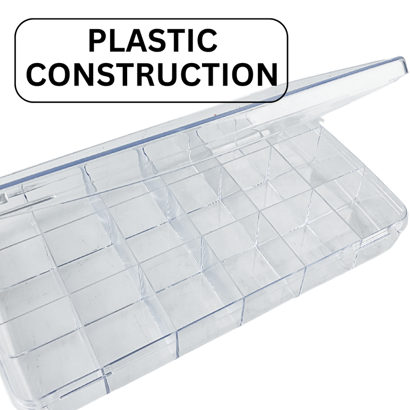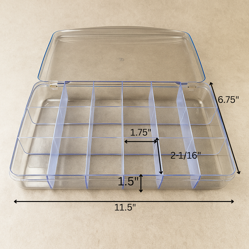 This storage box is great for storing your craft items, such as beads, buttons, sequins, stones, fittings, sewing items, etc. Each of the 18 sections measures: 1.75" x 2" x 1.5", and it makes a great way to sort and store just about any type of small items. It will keep your items neat, clean, and organized. The lid has two plastic hinges, and fits down lightly, and opens easily.* Made Of Clear Polystyrene * Divided Into 18 Sections * Each Section Is 1.75" X 2" X 1.5" * Great For Storage Of Small Items * Keeps Items Neat, Clean And Organized