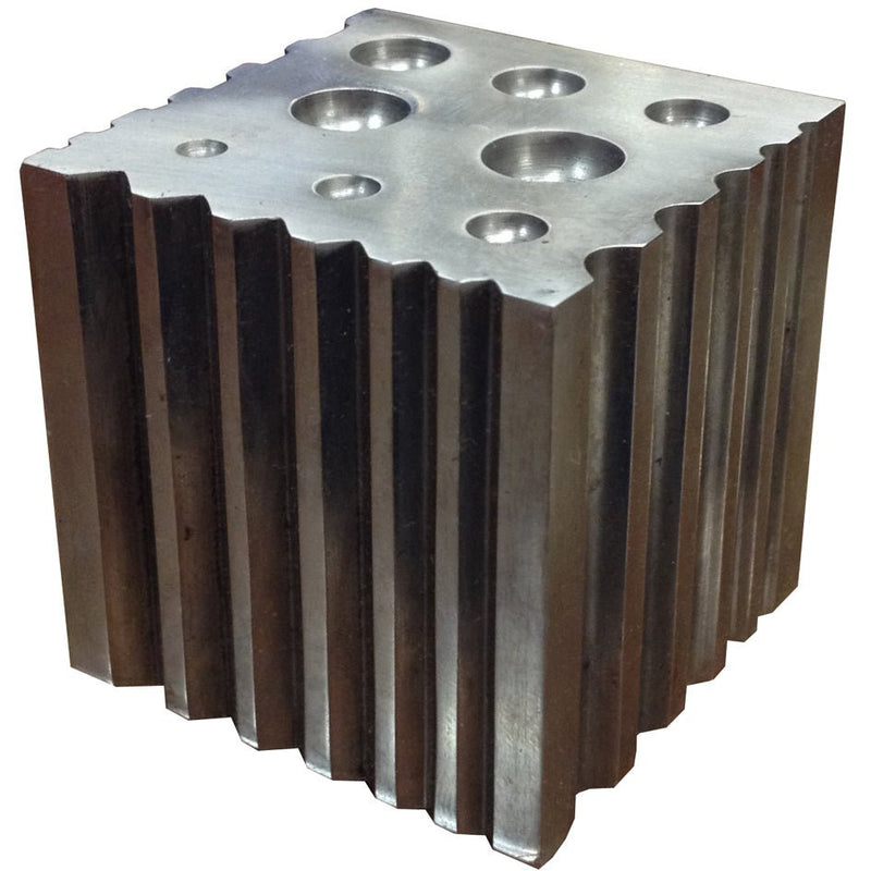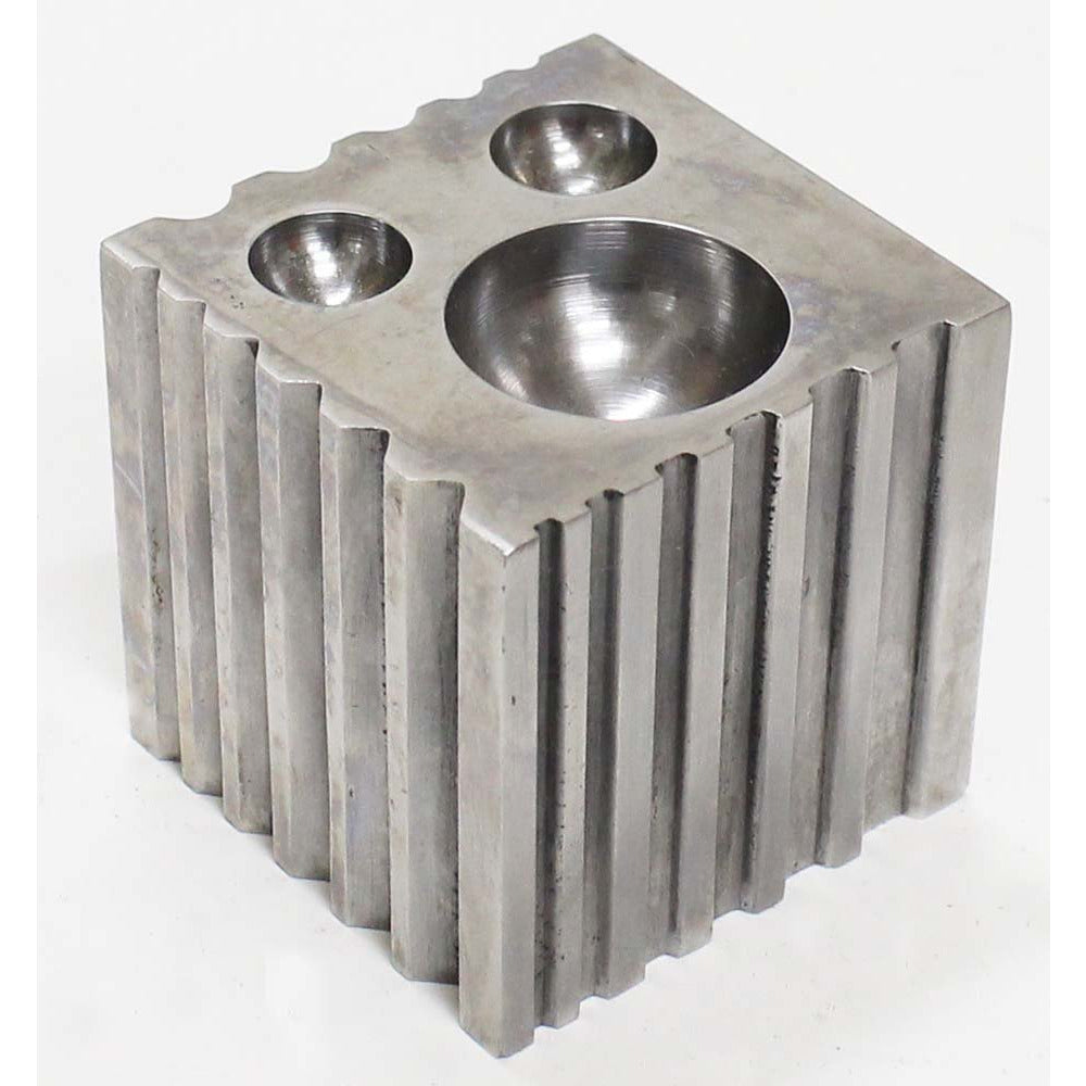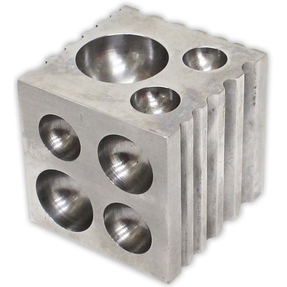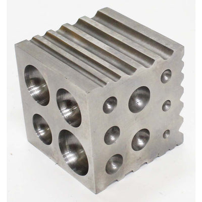Tough And Built To Last, This Polished Hardened Alloy Steel Cube-shaped Dapping Block Has 12 Half Spheres (from 4 - 40mm); 5 Cylinder-grooves And 5 "v" Shaped Linear Grooves. Cube Edge Measures About 2".* 2" Square Cube * 15 Round Cavity 4 to 14,16,18,20 & 25mm * 6 Rectangle, 5-U & 6-V-Shape Groove * Grinding/Polished Harden Steel * Cube weight: 1.95 Lbs.