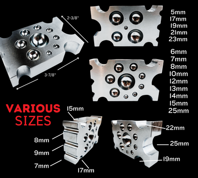 Here's the perfect block for ring shaping, stone setting, making bezels, and more. With 14 multiple sized half-sphere-shaped templates (ranging from 1/8" to 1") and 8 cylinder-grooves (ranging from 1/4" to 1"); block measures 2 1/2" x 4" x 1". Made of hardened steel alloy.Overall size is 4 x 2-1/2 x 1 inch and features half-sphere and half-cylinder shapes Weighs 2 pounds - Made of Hard steel, Tempered 50 degree 13 Half spheres in varios sizes from 1/8 inch to 1 inch in size 8 Half cylinders in various sizes ranging from 1/4 to 1 inch For the professional jewelry designer - great for use with wire and sheet metals