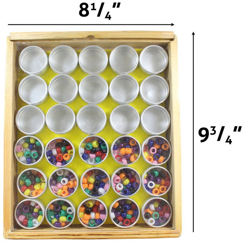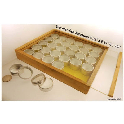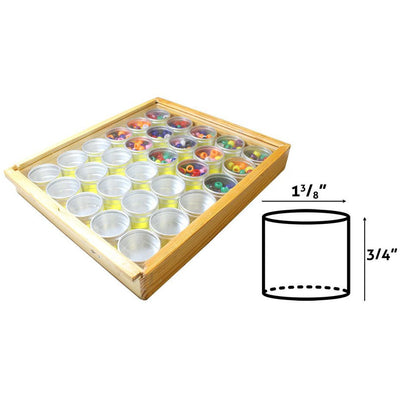 Modern 30 Piece Matt Aluminum, 1 5/16" Diameter X 7/8" Height With Clear Plastic Lids. All Made Of Quality Aluminum In A 9 1/4" X 8 1/4" X 1 3/8" Wooden Case With A Clever Sliding Clear Plastic Lid.Great for sorting small items such as Beads, Gems, Precious Stones* 30 Piece, 1 5/16" Jars * Clear Plastic Lids * Set Comes In Wooden Box * Box Is 9.25" X 8.25" X 1 3/8" * Sliding Clear Plastic Lid On Box with Locking Hinge