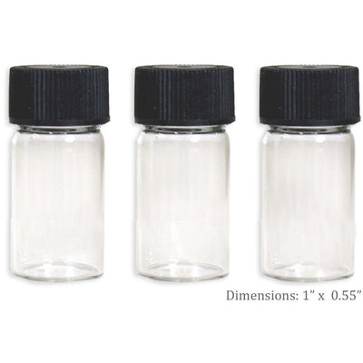 These vials are excellent for display of gem stones and other small items. Great for use in the science lab for samples and specimins. Perfect for entomology students. A good way to carry a dose of emergency medication.* Bottles Are Clear Glass, With Black Plastic Screw-on Caps - 100 Come In 1 Pack They are 1 inch in height and about 9/16 inch in diameter They are an excellent way to display gem stones or other small items Great for use in the science lab for samples or specimins - these vials come in a set of 100 pieces Can be used in the classroom for instruction in entomology and collecting specimens in the field