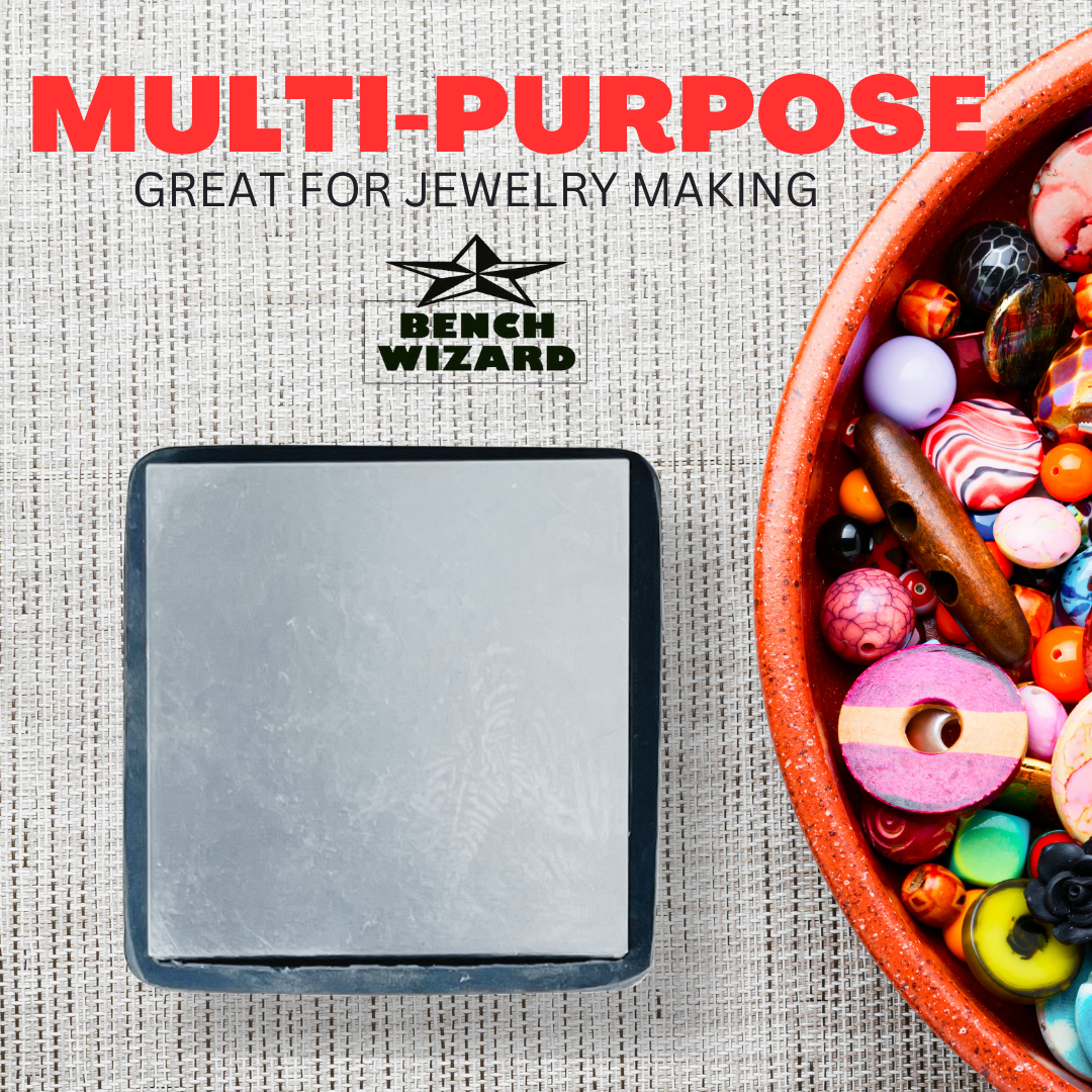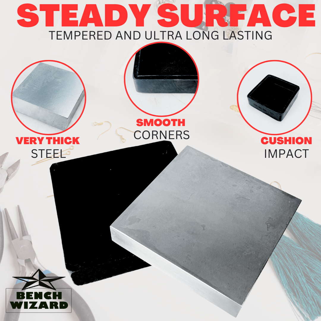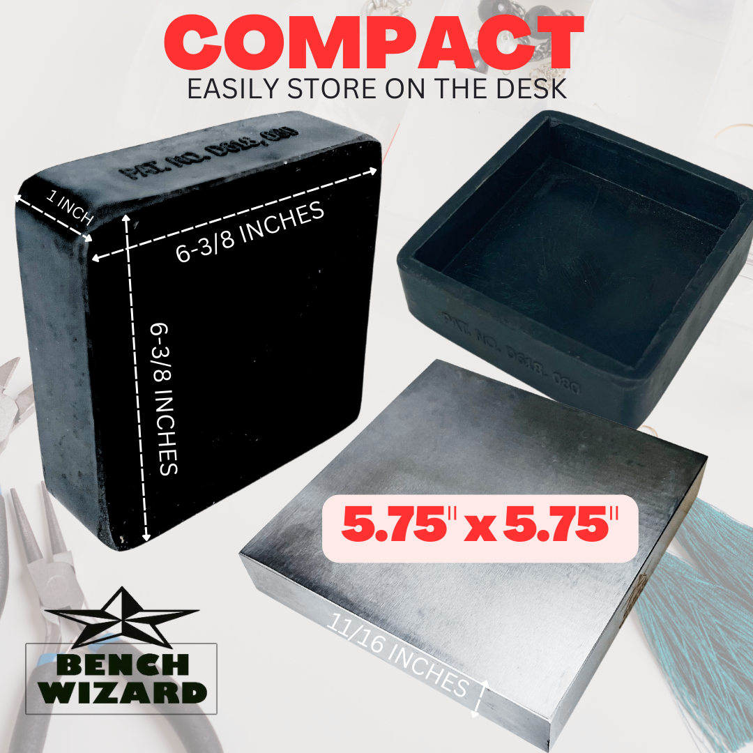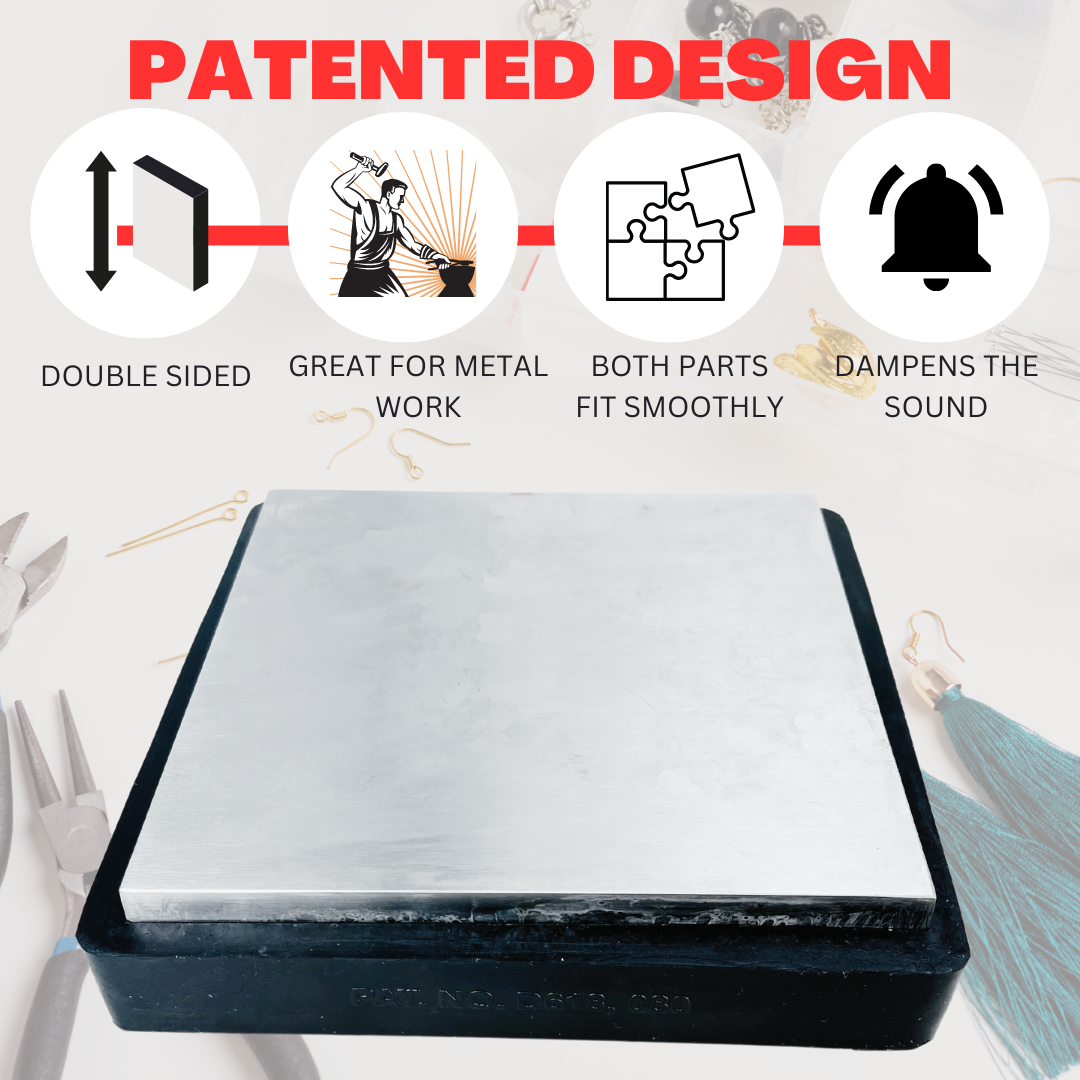 This patented design is the ideal workbench tool for the creative jewelry designer. Made to give you an extra large work area for flattening and shaping metal. The rubber side can also be used for a more gentle touch with no scratching. The steel plate can be removed or turned around inside the rubber, and the rubber also acts as a shock absorber for the hammer blows.* Solid Steel Plate Is 5-3/4 X 5-3/4 X 1/2 Inches-rubber Is 6-1/4 X 6-1/4 X 7/8 Inches * The Rubber Shield Can Be Removed And Placed Over The Other Surface Of The Steel * This Bench Block Is A Patented Design-larger Than Most-weighs 7 Pounds, 8.2 Ounces * The Rubber Side Can Be Used For A More Gentle Touch Without Scratching * The Rubber Side Can Protect Your Table Top And Absorb The Shock Of Hammer Blows