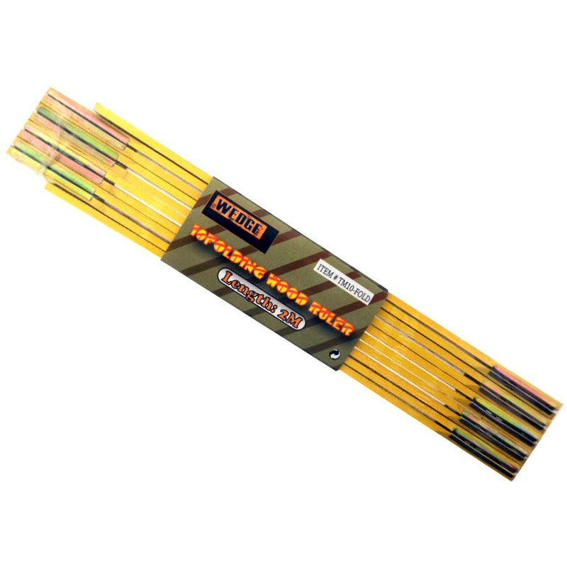 This handy folding wood ruler has a total length of 2m, and folds up neatly at a length of 9". It's great for carpentry and masonry work. It has high visibility black markings on a bright yellow background. This ruler is made of wood, and has zinc plated folding joints.* High contrast black-on-yellow marking * Inches & mm * Compact 9" folded size * Zinc plated folding joints * Total length - 2 meters