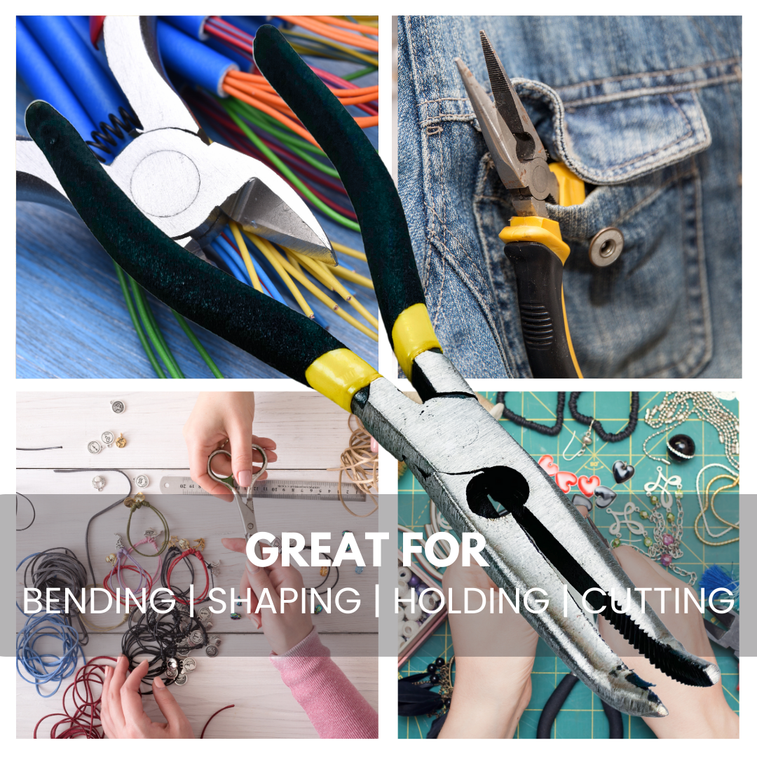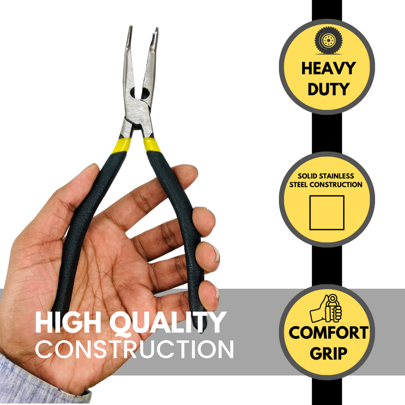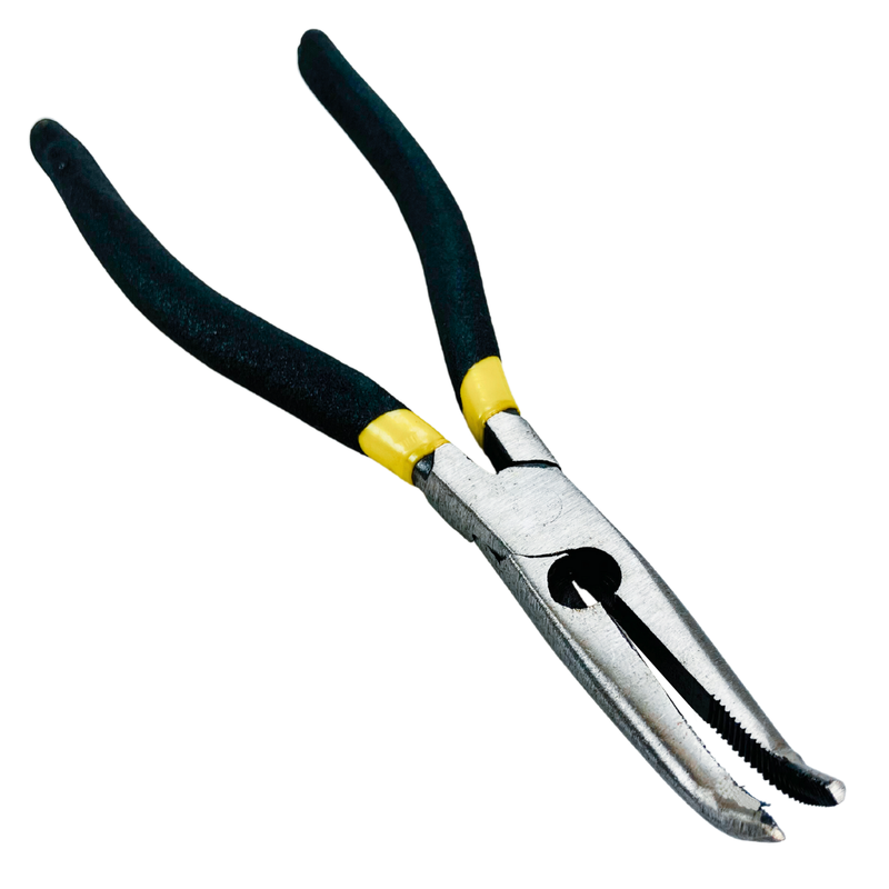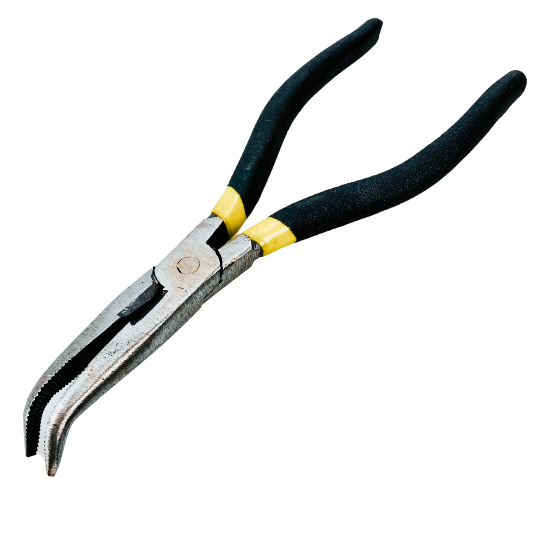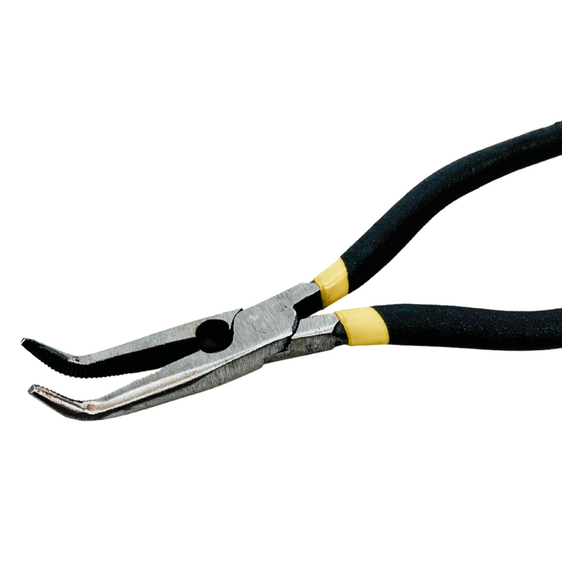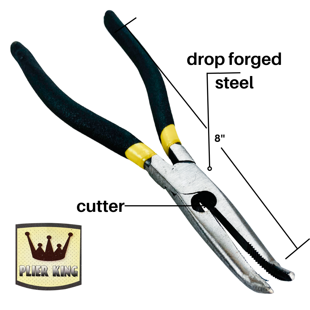 This Is A Pair Of Bent Nose Pliers You Will Reach For Time And Time Again. Solid, Sturdy And Heavy Duty, You Will Get Many Years Of Realiable Use From These Well-made Pliers. Dual Colored, Wrapped Handles Make Them Easy To Find In Your Toolbox.* Heavy duty bent nose pliers for electricians, jewelers, handymen, and other tradesmen * Excellent for gripping, twisting, bending, and cutting wires and cables * Comfortable duel colored handles (red/black) which provide solid nonslip grip * Heat treated & tempered carbon steel punch die, rust resistant oxide finish * 8 inches long, bent tip has strong "teeth" which provides sturdy grip on whatever object it holds