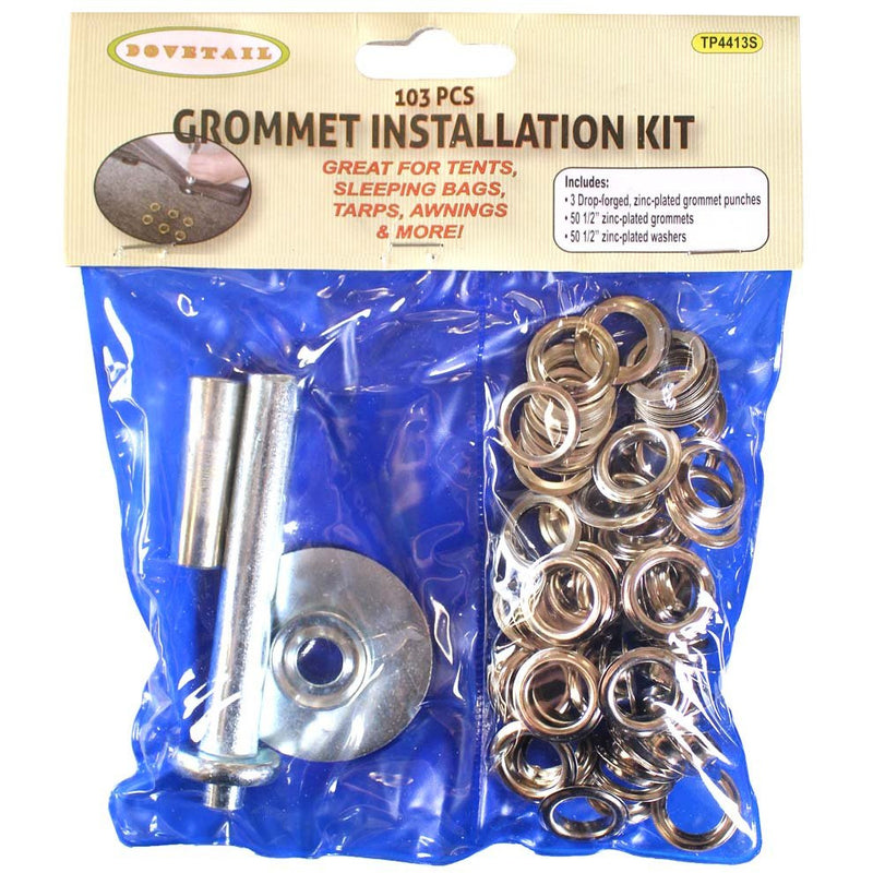 * This set includes 103 pieces of 1/2 inch size grommets in total, and weighs 9.3 ounces* The perfect way to add grommet holes, or to replace grommets that have come out* Includes 3 piece zinc plated grommet punches with complete instructions on package* Also includes 50 pieces of zinc plated grommets and 50 pieces of zinc plated washers* Excellent for tarps, canopies, sleeping bags, duffel bags and more