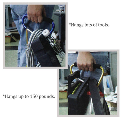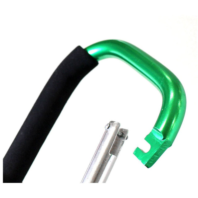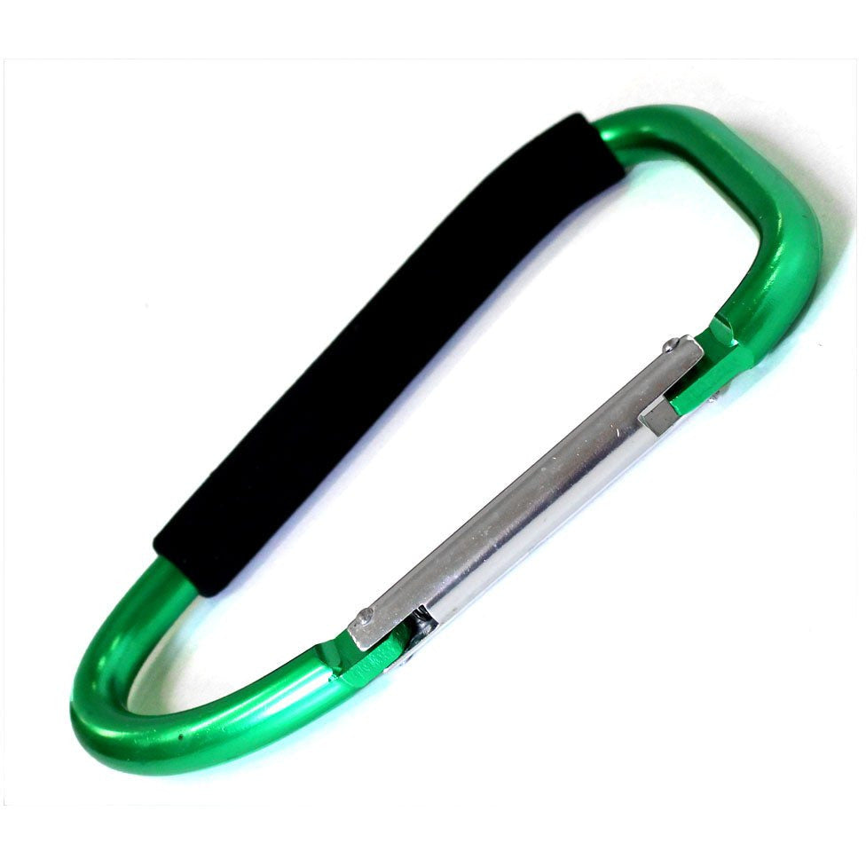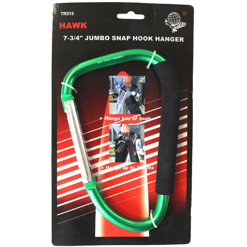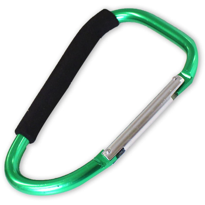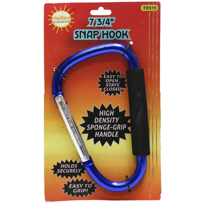This extra large snap hook opens with a locking mechanism. Appx. 7 3/4" long; available in bright colors: purple, blue, green, pink, gold and more. Holds keys, dog leashes, tools, and more. Holds up to 150 lbs! Easy to grip for portable uses, padded handle.* This jumbo snap hook measures 7 3/4 inches long x 4-1/2 inches across * Silver colored snap hook lever locks into place for a temporary closure * Use with ratcheting tie downs, carrying tools, and many other uses - holds 150 pounds * Not suitable for climbing gear - made of hollow aluminum tubing with rubberized handle grip * Lightweight construction - weighs only 7.3 ounces - take it along most anywhere