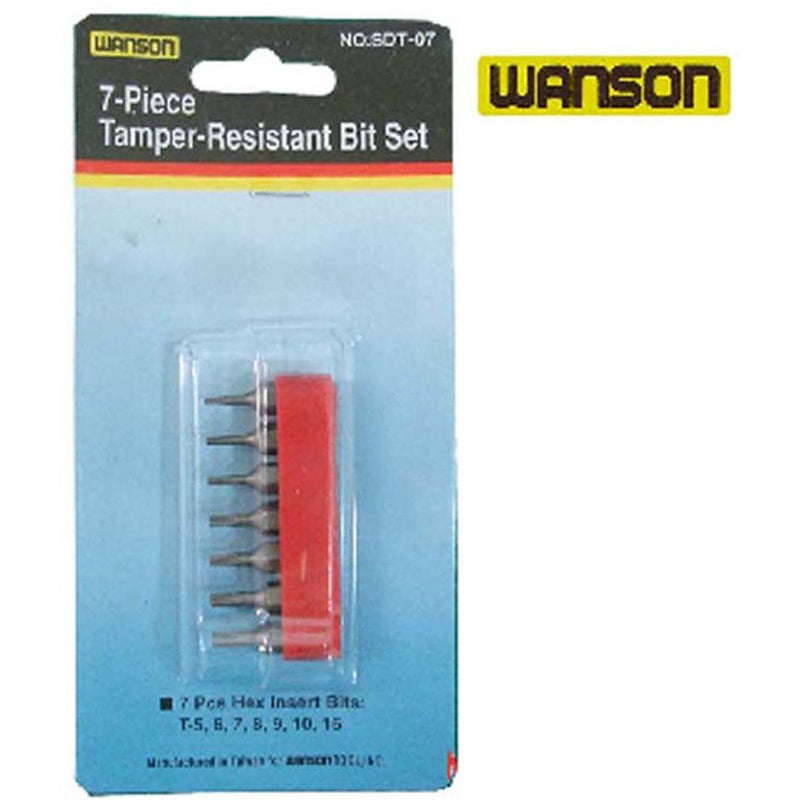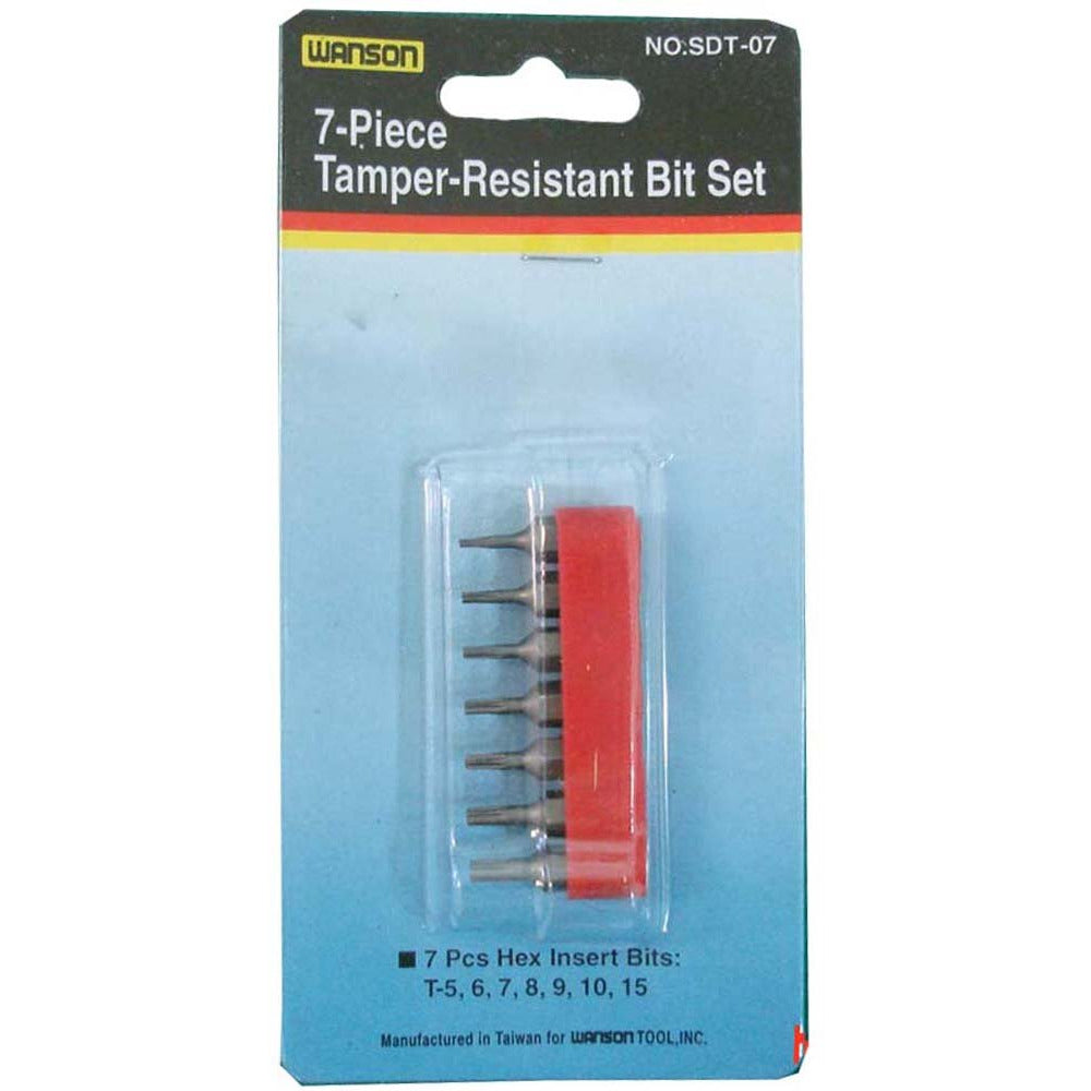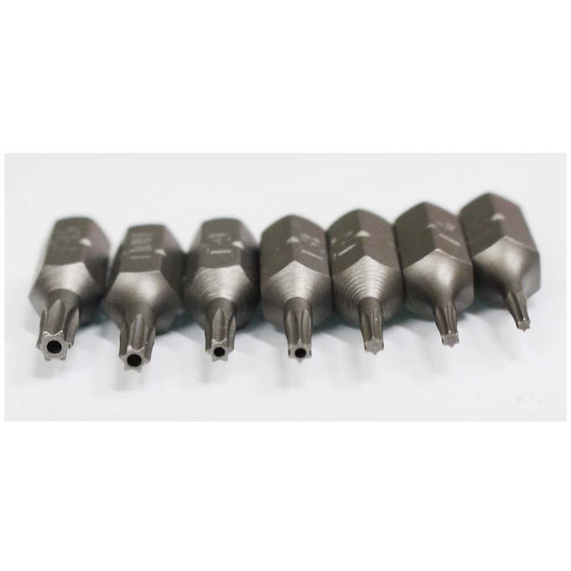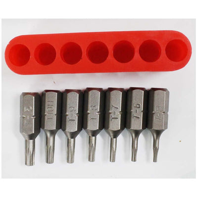 This 7 Piece Set Of Hex Insert Bits Includes Sizes: T-5, 6, 7, 8, 9, 10, And 15. Each Bit Is Fit Snugly Into It's Own Spot In The Storage Rack (included). The Rack Is Approx. 2.25" Long, And Will Fit Easily Into Any Tool Box.* 7 Pieces In Set * Tamper Resistant * Sizes 5,6,7,8,9,10, & 15 * Custom Fit Storage Rack * Excellent Quality