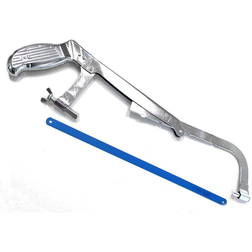Great for mitre boxes and home repair! Hacksaw can be adjusted to fit to 8, 10 and 12 inch blades. One 12 inch blade is included; other sizes are available separately. This hacksaw has a chrome finish and a comfort-grip handle. It will help you with many jobs and will do the job right!This saw frame has built-in notches to change sizes - it will accommodate an 8, 10 or 12 inch blade This hacksaw comes complete with one 12 inch blade - other sizes are available separately Easy grip handle-flared at an angle to protect your hand during sawing motion A Fine toothed saw (about 25 teeth per inch) for cutting metal, but works on plastic pipe & conduit 18 x 4 Inches overall - chrome finish over steel - great for the miter box