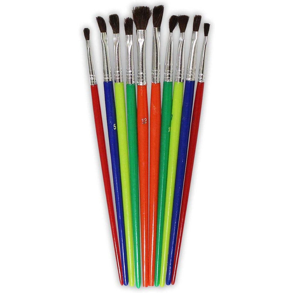 Great For Watercolors, Oils Or Acrylics, These Fan Brushes Have So Many Uses! They Work On Canvas, Silk, Wood, And More. Black Wooden Handles, Metal Mounts Keep Bristles Secure. Acrylic Bristles. Sizes Are 1 To 10. And The Multi-color Plastic Handles Are About 5" Long. An Economical Set Of Brushes, Perfect For Use In School. Great For A Rainy Day Project At Home.* Set Of 10 * Different Colored Handles * Various Size Brush Tips 1-10 * Economical * Includes 2 Packs Of 10 Piece Set With Displays