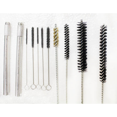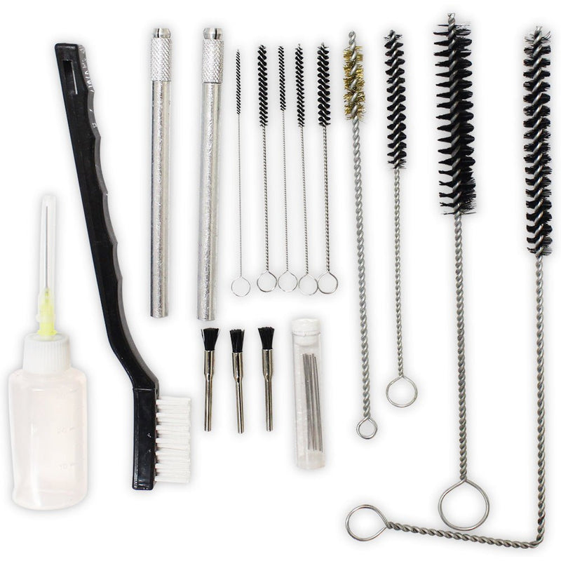 This kit has all the tools you really need to clean your air spray gun equipment. They will always deliver the best performance when they are cleaned after every use This kit includes 3 large brushes, 2 piece mini brushes, bottle of lubrication, storage case and more.3 Pc large brush, 1 pc brass brush, 3 pc mini straight brush, 5 pc mini brush 6 Pc micro needle, 1 bottle lubrication, 2 pc aluminum holder, 1 pc large cleaning brush Great for cleaning all types of spray guns - gravity, suction, pressure feed, HVLP, etc. Helps clean air caps, air passages, fluid tip and the outside of the spray gun Every spray gun owner or user should have this set handy for daily cleaning of equipment
