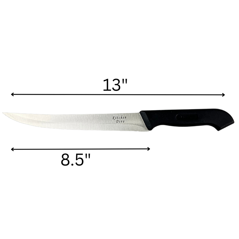This carving knife features an 8-inch high-quality stainless steel blade that’s razor sharp and ready for any kitchen carving task. Whether you’re slicing meat, bread, fruit, or vegetables, this knife makes the job quick and effortless. The 5-inch handle is crafted from thickened polypropylene, designed for a secure, comfortable grip while keeping your hand safely away from the blade. Perfect for carving roasts, slicing rib bones, or preparing large cuts, this knife also includes a protective plastic tip shield to prevent accidental injuries when not in use.