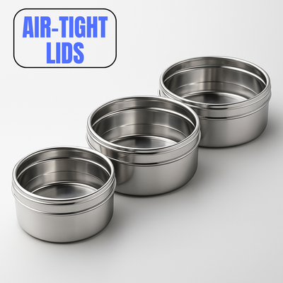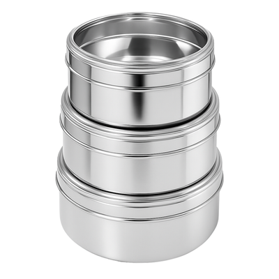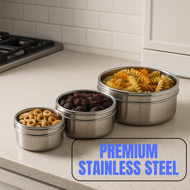 The canisters come in three graduating sizes (diameters: 6.5", 7.125", and 7.625"; depths: approx. 2.5", 2.75", and 3") and nest neatly inside each other when not in use. The tight-sealing lids help protect contents from air, moisture, and pests—ensuring your dry goods stay flavorful and fresh.